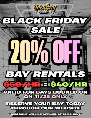 Our Black Friday sale is live! Get 20% OFF bay rentals on November 28th, one day only!We’re dropping the deal early so you can plan ahead and lock in your spot.Don’t wait, bays will fill up fast. Reserve a bay through our website now! Discount will be applied at checkout.