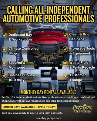 Attention Mechanics, Vinyl Wrappers, and Automotive Detailers. If you’re seeking a professional space to operate and grow your business, we have the perfect solution for you! We are now offering long term service bay rentals designed for independent technicians and automotive professionals who want a fully equipped, turnkey workspace without the burden of overhead costs. Each bay features a 2-post lift, a 10’ professional workstation stocked with 700+ tools, including air and specialty tools, as well as waste fluid recycling and parts disposal for a seamless workflow. Our facility is climate controlled, secure, and open daily from 10 AM to 9 PM, providing the flexibility and comfort you need to serve your clients efficiently. Position your business for success with a premium workspace that elevates your professionalism and productivity. Contact us today for details, rates, and availability.
